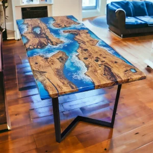 Epoxidharz Tisch aus rustikaler Eiche mit Kreuzgestell 300×110